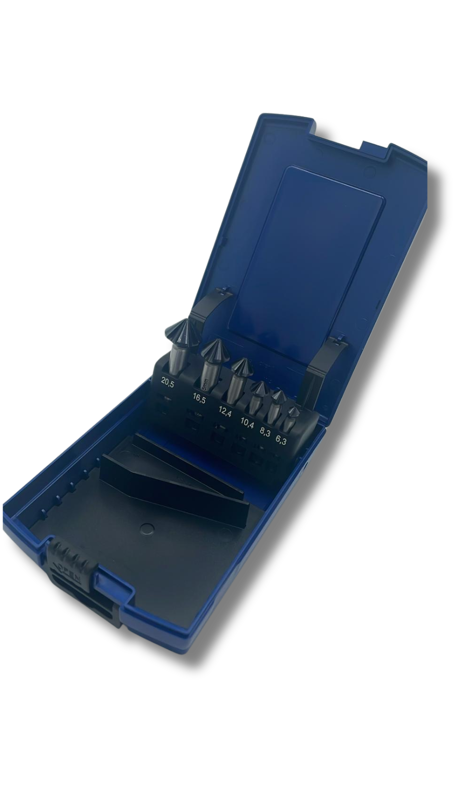 HSS-G TiALN U Nut Kegelsenker Satz 6tlg. 90° DIN 335 Form C, ungleiche Teilung, 3kant Schaft, 5 Schneiden, PREMIUM (6,3 and 10,4 mm 3 Schneiden)